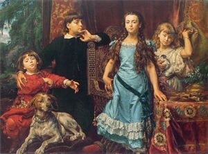 During the January Uprising of 1863, in which he did not directly take part on account of his poor health, Matejko supported it financially, donating most of his savings to the cause, and personally transporting arms to an insurgents' camp.[16] Subsequently, his Skarga's Sermon (Kazanie Skargi), May 1864, was exhibited in the gallery of the Kraków Society of Friends of Fine Arts, which gained him much publicity.[16] On 5 November that same year, he was elected member of the Kraków Scientific Society (Towarzystwo Naukowe Krakowskie) in recognition for his contributions to depicting great national historical themes.[19] On 21 November he married Teodora Giebułtowska, with whom he went on to have five children: Beata, Helena, Tadeusz, Jerzy and Regina.[16] His daughter, Helena, also an artist, later helped World War I victims and was awarded the Cross of Independence by President Stanisław Wojciechowski.[20]