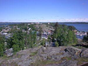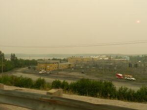 Yellowknife is on the Canadian Shield, which was scoured down to rock during the last ice age.[30] The surrounding landscape is very rocky and slightly rolling, with many small lakes in addition to the larger Great Slave Lake.[31] Trees such as spruce and birch are abundant in the area, as are smaller bushes, but there are also many areas of relatively bare rock with lichen.[32] Yellowknife's high latitude causes a large variation between day and night. Daylight hours range from five hours of daylight in December to 20 hours in June. Civil Twilight lasts all night from late May to mid-July.[33]
