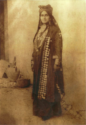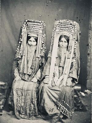 High-class Yomut women from Krasnovodsk, Turkmenistan wearing Kasaba