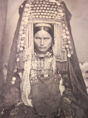 Traditionally, the khasava was worn by young brides on their wedding day, removed during the gaytarma period (the temporary return of the bride to her family’s home after the wedding before fully settling into her husband’s house), and then worn again until the birth of the first or second child. By the early 20th century, variants of the khasava were widespread among young and middle-aged women regardless of childbirth status, though the tall type became rare and was gradually replaced by a shorter form known as alym dany (or beruk, a style borrowed from Iranian women). Different Turkmen tribes used various local names for similar headdresses, including borik (Teke), topby/topba (Sarakhs), bagmak (Ersari), chanie (Nokhur), uramak (northern Yomut), aladaŋy (western Yomut), kars (Khatab and Mukry), dastar (Salyr and Geoklen), and pechek (Lebap).[15]