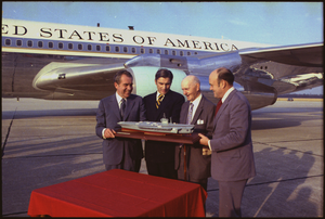 الرئيس ريتشارد نيكسون، وزير البحرية جون وارنر، ووزير الدفاع ملڤين ليرد يقدمان نموذج السفينة التي سيتم تسميتها على اسمه لعضو الكونگرس ڤنسون (الثالث من اليسار)، 18 نوفمبر 1973.
