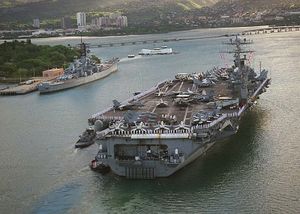 كارل ڤنسون تدخل پيرل هاربر with CVW-11 aboard with يوإسإس Missouri in background