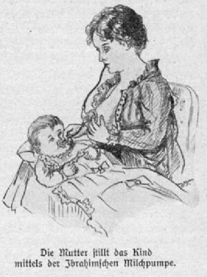 رسم توضيحي من كتاب طب أطفال ألماني يبين أمًا تستخدم مضخة الثدي التي ابتكرها يوسف إبراهيم لإرضاع طفلها