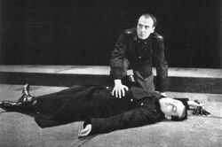 Antony (George Coulouris) kneels over the body of Brutus (Orson Welles) at the conclusion of the Mercury Theatre production of Caesar (1937–38)