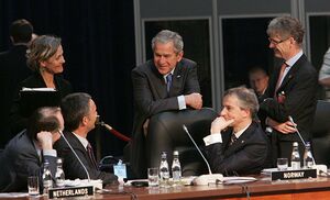 Støre and Jens Stoltenberg with US President George W. Bush during the NATO Summit in April 2008