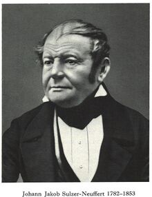 Johann Jakob Sulzer was born in Winterthur as the son of Salomon . He completed an apprenticeship in his father's foundry as a turner and caster. In 1806, Sulzer married Anna Catharina Neuffert, the daughter of a Winterthur pharmacist. In 1807, after his father's death, he took over the brass foundry on the city moat, which at the time mainly produced bells . He experimented with iron casting for years until he achieved a satisfactory result in 1827.