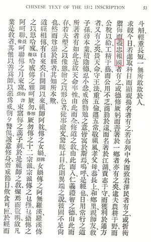 The Kaifeng Jews, one of many pockets of Chinese Jews living in ancient China, refer to this tattoo in two of their three stele monuments created in 1489, 1512, and 1663. The first mention appeared in a section of the 1489 stele referring to the Jews' "Boundless loyalty to the country and Prince".[27] The second appeared in a section of the 1512 stele about how Jewish soldiers and officers in the Chinese armies were "boundlessly loyal to the country".[28]