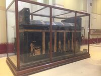 Yuya was interred within a rectangular wooden sarcophagus placed against the north wall; its lid was shaped like the vaulted per-nu shrine of Lower Egypt. Though appearing to sit on sledge runners, it had no base so the three nested gilded (and silvered) anthropoid coffins sat flat on the floor.[21] The long south side of the sarcophagus had been broken in by ancient robbers, who had also moved the short eastern side and left the lid askew, balancing precariously. The lids of each of the nested coffins had been removed with two placed atop each other supported by a chair, and one tipped on its side next to the sarcophagus; the troughs were left in place. His gilt cartonnage mask was still in place, although it was broken.[2]