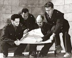 الوفد الإسرائيلي إلى مباحثات اتفاقيات الهدنة 1949. من اليسار إلى اليمين: القادة يهوشفاط هاركابي، آرييه سيمون، إيگال يادين، وإسحاق رابين (1949)