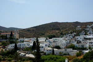 The three villages of Prodromos (formerly Dragoulas), Marmara and Marpissa (formerly Tsipidos), situated on an open plain on the eastern side of the island, and rich in remains of antiquity, probably occupy the site of an ancient town.[2] They are known together as the "villages of Kephalos" after the steep and lofty hill of Kephalos.[2] On this hilltop stands the monastery of Agios Antonios (St. Anthony). Around it are the ruins of a medieval castle which belonged in the late Middle Ages to the Venetian noble family of the Venieri.[2] They gallantly but vainly defended it against the Turkish admiral Barbarossa in 1537.