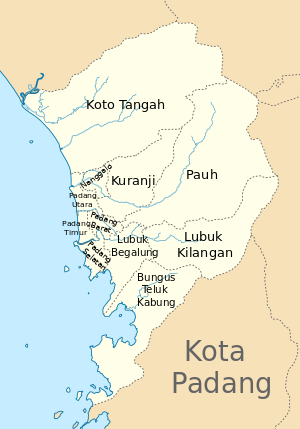 The city of Padang is located on the west coast of the island of Sumatra, with a total area of 694.96 km2, equivalent to 1.65% of the area of West Sumatra.[15] More than 60% of the area of Padang is in the form of hills covered by protection forests. Only around 205.007 km2 of the territory is an urban area.[16] The hills stretch in the east and south of the city. The notable hills in Padang include Lampu Hill, Mount Padang, Gado-Gado Hill, and Pegambiran Hill. The city of Padang has a coastline of 68.126 km on the mainland of Sumatra. In addition, there are also 19 small islands, including Sikuai Island with an area of 4.4 ha in Bungus Teluk Kabung District, and Toran Island covering 25 ha and Pisang Gadang Island in Padang Selatan District.[17][18]