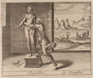 وحسب أوڤيد، فبعد أن رأى پگماليون الپروپوئتيدس يقمن بالدعارة فقد قرر أنه "غير مهتم بالنساء".[3] هذا الأمر دفعه لأن يخلق إمرأة لنفسه على شكل تمثال، ثم سقط في غرامها.