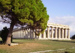 وقد أقام اليونان هذه الأضرحة لآلهة الحب والبحر - وأغلب الظن أن أقدم هذه المباني، وهو البناء الذي سُمي فيما بعد "الباسلكا Basilika "، كان هيكلاً لبوسيدن. وقد شاده له الأقوام الذين يعتمدون في طعامهم على فاكهة البحر المتوسط وتجارته حوالي منتصف هذا القرن السادس العجيب، الذي خلق كل عظيم في الفن والأدب والفلسفة بين إيطاليا وشانتنج Shantung. وقد بقيت من هذا الهيكل أعمدته الداخلية والخارجية شاهدة على شغف اليونان بإقامة العمد.[1] وأقام الجيل الذي تلاه هيكلاً أصغر من هذا الهيكل شبيهاً به في بساطته وقوته الدوريتين. ونحن نسميه "هيكل سيريز Ceres" ولكنا لا نعرف أي الآلهة كان يشم رائحة قرابينه. وشاد جيل بعد هذا الجيل أيضاً؛ قبيل الحرب الفارسية أو بعدها(55)؛ أعظم الهياكل الثلاثة وأحسنها تناسباً؛ وأكبر الظن أنه شيد لبوسيدن أيضاً - وهو من أجدر الهياكل بهذا الإله لأن في وسع الإنسان أن يطل من أروقته على صفحة البحر الغدار الذي يغري المطل عليه بركوبه. وأينما ولى الإنسان وجهه في هذا الهيكل رأى عمداً: ففي الخارج رواق دوري قوي كامل البناء، وفي الداخل رواق من العمد ذو طابقين كان يحمل أعلاها فيما مضى سقفاً. وذلك منظر من أعظم المناظر الإيطالية تأثيراً في النفس؛ ولا يكاد الإنسان يصدق أن هذا الهيكل الذي احتفظ بكيانه أحسن مما احتفظ به أي هيكل شاده الرومان، كان من عمل اليونان قبل ميلاد المسيح بخمسة قرون لا تكاد تنقص شيئاً. وفي وسعنا أن نستدل منه على ما كان للأقوام الذين شادوا أمثال هذا المركز لحياتهم الدينية من حيوية وولع بالجمال، وما كانوا يستمتعون به من موارد ثراء ومن حسن ذوق. وفي وسعنا أن نتصور من بعد هذا صورة واضحة جلية لما كانت عليه المدن الكبرى مثل ميليتس، وساموس، وإفسوس، وكروتونا، وسيباريس وسرقوسة من أبهة وثراء.