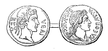 Ptolemy married a woman named Julia Urania, who came from obscure origins. She is only known through a funeral inscription found at Caesaria through her freedwoman Julia Bodina. Bodina ascribed Julia Urania as "Queen Julia Urania". There is a possibility that Julia Urania was a member of the royal family of Emesa (modern Homs, Syria). Drusilla, who is recorded as descendant of Cleopatra VII and Mark Antony, was most likely the daughter of the royal couple, born around 38.[7][8][9]