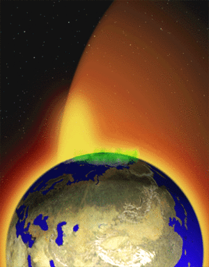 الأرض منبع البلازما حيث نرى أيونات الأكسجين و الهيدروجين و الهليوم تتدفق إلى الفضاء من مناطق قريبة من القطبين. اللون الأصفر الذي فوق القطب الشمالي يرمز إلى ضياع الغازات إلى الفضاء الخارجي. المنطقة الخضراء ترمز إلى شفق القطب الشمالي أو طاقة البلازما التي تتدفق عائدة إلى الأرض