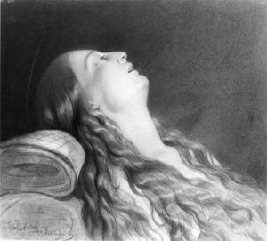 Delaroche's love for Horace Vernet's daughter Louise was the absorbing passion of his life. He married Louise in 1835, in which year he also exhibited Head of an Angel, which was based on a study of her. It is said that Delaroche never recovered from the shock of her death in 1845 at the age of 31. After her loss he produced a sequence of small elaborate pictures of incidents in Jesus's Passion.[3] He focused attention on the human drama of the Passion, as in a painting where Mary and the apostles hear the crowd cheering Jesus on the Via Dolorosa, and another where St. John escorts Mary home after her son's death.