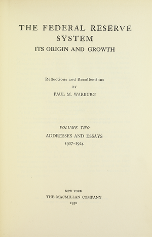 - ^ Paul Warburg, The Federal Reserve System: Its Origins and Growth—Reflections and Recollections, vol. 1, New York: Macmillan, 1930, pp. 20-21.
