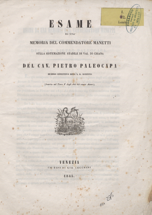 - Paleocapa, Pietro (1845). Esame di una memoria del commendatore Manetti sulla sistemazione stabile di Val di Chiana. Venezia: co' tipi di Gio Cecchini.