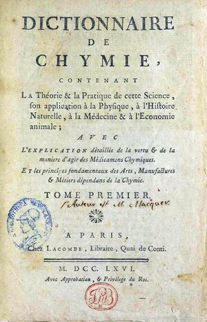 He is known for his Dictionnaire de chymie (1766). He was also involved in practical applications, to medicine and industry, such as the French development of porcelain. He worked as a chemist in industries, such as the Manufacture de Sèvres or the Gobelins Manufactory.[1] He was an opponent of Lavoisier's theories. The scholar Phillipe Macquer was his brother.