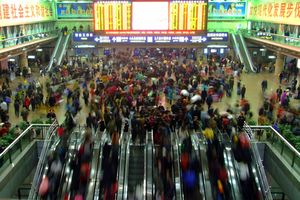 مشهد من چونيون 2008 داخل محطة سكك حديد بكين الغربية، الصين.