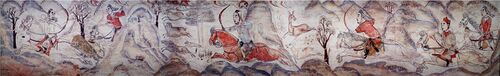 The Northern Qi, although founded by a ruler of mixed Han/Xianbei origin, strongly asserted their Xianbei ethnic cultural identity. They regarded surviving ethnic Tuoba (themselves also Xianbei) and non-Han of the Northern Wei court and as well as literati of all ethnicities as near Han, referring to them as Han'er or Han kids (漢兒).[10] However they employed Han and sometimes Central Asian courtiers.[22] While some Qi elite families had expressed strongly anti-Han sentiments due to unclear reasons, they may also lay claim to Han elite origin.[8] Emperor Wenxuan's father Gao Huan himself said different things to Han and Xianbei, saying to the Han Chinese that "The Xianbei are your clients, you give them a measure of grain and a bolt of cloth, and they fight for you and enable you to have peace and order, why do you hate them?" and he said in Xianbei to Xianbei people that "The Chinese are your slaves, they [the men] farm for you, the women make your clothing, they bring you your supplies and clothing, keeping you warm and full, why do you want to suppress them?".[23][24] was descended from the Gao family of Bohai (渤海高氏) of ethnic Han descent in what is now modern Hebei.[25] He had become Xianbeified as his family had lived for some time in Inner Mongolia after his grandfather was relocated from Bohai.[26][27]