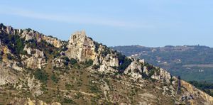 View of the ruined Château de Crussol, in Ardèche, seen from the esplanade of the Champ de Mars (fr).