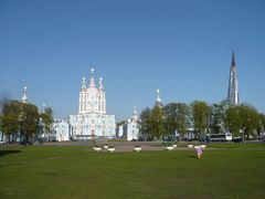 عمل لصقي يبين كيف ستبدو ناطحة السحاب اوختا سنتر المثيرة للجدل سنبدو بجانب كاتدرائية سمولني التاريخية، من صنع بارتولوميو راسترلي.