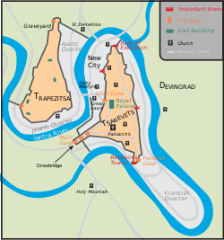 وكثيراً ما يشار إليها بلقب "مدينة القياصرة"، تقع ڤليكو ترنوڤو على نهر يانترا and is famously known as the historical capital of the Second Bulgarian Empire, attracting many tourists with its unique architecture. The old part of the town is situated on three hills, Tsarevets, Trapezitsa, and Sveta Gora, rising amidst the meanders of the Yantra. On Tsarevets are the palaces of the Bulgarian emperors and the Patriarchate, the Patriarchal Cathedral, and also a number of administrative and residential edifices surrounded by thick walls.