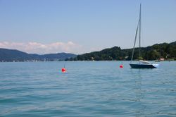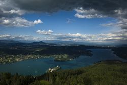 Wörthersee is Carinthia's largest lake. It is elongated, about 16.5 km (10.3 mi) long and 1.5 km (0.93 mi) wide, and stretches from the outskirts of the Carinthian capital Klagenfurt in the east to the bay of Velden in the west. Situated within the Klagenfurt Basin, its shores are flanked to the north and south by the foothills of the Gurktal Alps and the Karawanks range, all covered with dense forests beyond which snow-capped Alpine peaks are visible. The lake's water is of a distinctive blue-green colour and transparent.