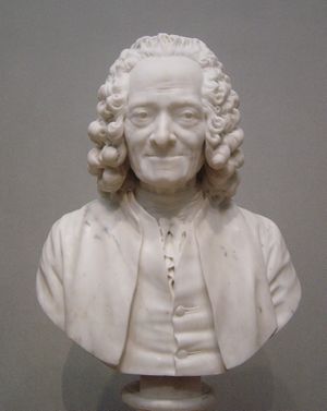 فرانسوا-ماري أرويه ( François-Marie Arouet ؛ بالفرنسية: [fʁɑ̃swa maʁi aʁwɛ] ؛ 21 نوفمبر 1694 - 30 مايو 1778) عرف باسمه المستعار م. دى ڤولتير ( M. de Voltaire ؛ []vɒlˈtɛər,_vlʔ[];[5][6][7] also الأمريكي []vɔːlʔ[];[8][9] بالفرنسية: [vɔltɛːʁ])، اشتهر بـ he was famous for his wit, in addition to his criticism of Christianity—especially of the Roman Catholic Church—and of slavery. Voltaire was an advocate of freedom of speech, freedom of religion and separation of church and state.
