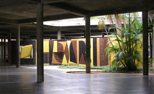 Between 1948 and 1951, two new periods appeared, taking even further the ideas already exposed in Belle-Isle. From the “DENFERT” period (1951-1958) emerged the curious drawings of the cracked white tiled walls of the Denfert-Rochereau metro station in Paris. The alternation of backgrounds and forms, the enmeshing of the sun splashed or shadow blurred walls and the spaces between these walls, correspond to the origin of the “CRISTAL -GORDES” period (1948-1958). In the studies from these periods, forms are juxtaposed in beaches of contrasting colors on a flat surface. Vasarely rediscovers the contradictory perspectives of axonometry, the power of pure composition. The most representative work of this period is “Homage to Malevitch” (1952-1958), which marks the turn towards kineticism. In this painting the square has been turned on its axis and transformed into a rhombus, thus creating a visual principle that would always remain at the center of the artist’s kinetic research. In 1954, Vasarely returns to this homage for the construction of his first architectural integration at the University of Caracas, Venezuela, in collaboration with architect Carlos Villanueva.