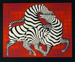 Continuing his studies on movement and perception, Vasarely returned to drawing in his “VONAL” period (1964-1970), where he rediscovered his linear work on the theme of the zebras, the grills, and the origins of his black and white period, this time incorporating the element of color. A new kinetic aspect was engendered as well as a new spatial dimension through the repetition of lines decreasing in scale as they approach the center of the painting.