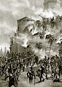 From the late 18th century, Russia actively started to increase its enroachments into Iranian and Turkish territory to the south. Following the annexation of eastern Georgia in 1801, Russia was now keen to conquer the rest of the Iranian possessions in the Caucasus. Russian expansion into the South Caucasus met particularly strong opposition in Ganja. In 1804, the Russians, led by General Pavel Tsitsianov, invaded and sacked Ganja, sparking the Russo-Persian War of 1804–1813.[23] Some western sources assert that "the capture of the city was followed by a massacre of up to 3,000 inhabitants of Ganja by the Russians".[24] They also claim that "500 of them were slaughtered in a mosque where they had taken refuge, after an Armenian apprised the Russians that there might have been 'Daghestani robbers' among them".[25]