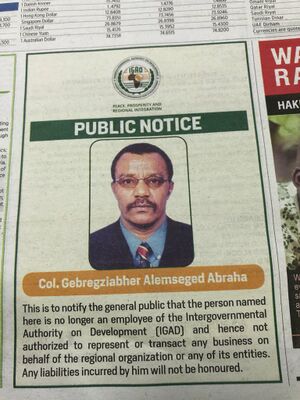 وفي خرق واضح للبروتوكول، قدمت إيگاد إخطارًا عامًا لصحيفة ديلي نيشن الكينية تعلن فيه إنتهاء خدمات گبرى. في الإشعار الذي نشرته الجريدة يوم الثلاثاء 26 يونيو 2017، أكدت إيگاد مجدداً أن الجنرال، المكروه على نطاق واسع في الأوساط الصومالية، "لم يعد موظفًا في الهيئة الدولية للتنمية (إيگاد) وبالتالي غير مصرح له بتمثيلها أو التعامل مع أي شيء، بالنيابة عن المنظمة الإقليمية أو أي من كياناتها". ولم توضح إيگاد سبب إصرارها على الإعلان عن رحيل الجنرال بهذه الطريقة.