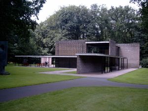 كانت السمات الأساسية تحت تأثير De Stijl مما أسفر عن أعمال ذات هندسة صارمة، فضلا عن الحد من اللون إلى الألوان الأساسية الأصفر والأحمر والأزرق. وهي تمثل محاولة، لمزج الفنون البصرية والتصميم والعمارة معا.