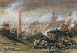 The largest change to industrial Glamorgan was the opening up of the South Wales coalfield, the largest continuous coalfield in Britain, which occupied the greater part of Glamorgan, mostly north of the Vale.[67] The coalfield provided a vast range in quality and type, but prior to 1750 the only real access to the seams was through bell pits or digging horizontally into a level where the seam was exposed at a river bank or mountainside.[68] Although initially excavated for export, coal was soon also needed for the smelting process in Britain's expanding metallurgical industries. Developments in coal mining began in the north-eastern rim of Glamorgan around the ironworks of Merthyr and in the south-west around the copper plants of Swansea.[68] In 1828 the South Wales coalfield was producing an estimated 3 million tons of coal, by 1840 that had risen to 4.5 million, with about 70 percent consumed by local commercial and domestic usage.