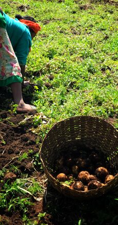 Ensete can be prepared in a variety of ways. A normal Gurage diet consists primarily of kocho, a thick bread made from ensete, and is supplemented by cabbage, cheese, butter and grains. Meat is not consumed on a regular basis, but usually eaten when an animal is sacrificed during a ritual or ceremonial event.[12] The Gurage pound the root of the ensete to extract the edible substance, then place it in deep pits between the rows of ensete plants in the field. It ferments in the pit, which makes it more palatable. It can be stored for up to several years in this fashion, and the Gurage typically retain large surpluses of ensete as a protection against famine.[13]