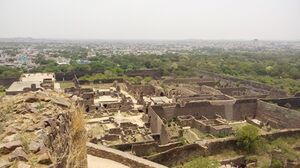 گولكنده/غولكنده Golconda هي قلعة حصينة وأطلال مدينة تقع في الأطراف الغربية لمدينة حيدر آباد, Telangana, India.[1][2] The fort was originally built by Kakatiya ruler Pratāparudra in the 11th century out of mud walls.[3] It was ceded to the Bahmani Kings from Musunuri Nayakas during the reign of the Bahmani Sultan Mohammed Shah I, during the first Bahmani-Vijayanagar War. Following the death of Sultan Mahmood Shah, the Sultanate disintegrated and Sultan Quli, who had been appointed as the Governor of Hyderabad by the Bahmani Kings, fortified city and made it the capital of the Golconda Sultanate. Because of the vicinity of diamond mines, especially Kollur Mine, Golconda flourished as a trade centre of large diamonds known as Golconda Diamonds. Golconda fort is currently abandoned and in ruins. The complex was put by UNESCO on its "tentative list" to become a World Heritage Site in 2014, with others in the region, under the name Monuments and Forts of the Deccan Sultanate (despite there being a number of different sultanates).[1]
