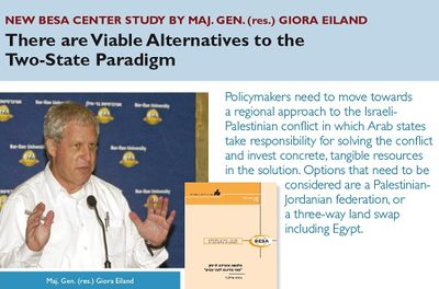 صورة الصفحة الأولى للاستعراض للتقرير في النشرة الشهرية باللغة الإنجليزية الصادرة عن مركز بيگن-السادات للدراسات الاستراتيجية في منتصف يناير 2010. ويظهر فيه كاتب المقترح الجنرال گيؤرا أيلاند وصورة لغلاف الكتيب بالعبرية.