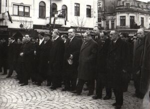 Born in Bârlad (1901), Gheorghiu-Dej was involved in the communist movement's activities from the early 1930s. Upon the outbreak of World War II in Europe, he was imprisoned by Ion Antonescu's regime in the Târgu Jiu detention camp, and escaped only in August 1944. After the forces of King Michael ousted Antonescu and had him arrested for war crimes, Gheorghiu-Dej together with prime-minister Petru Groza pressured the King into abdicating in December 1947, marking the onset of out-and-out Communist rule in Romania.
