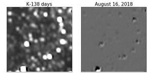 صور اكتشاف 2014 MU69، مقتطعة من صور التقطتها الكاميرا الواسعة المجال 3 في 26 يونيو 2014.