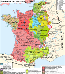 فرنسا 1180: أملاك التاج الفرنسي (بالأزرق). أراضي پلانتجنت (بالأحمر). |