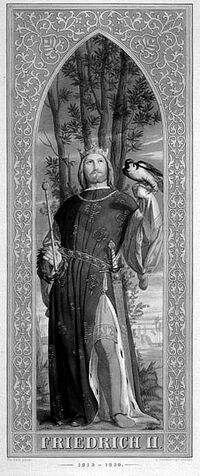 تصوير رومانسي لـفريدريك الثاني. كان حفيد فريدريك بربروسا وروجر الثاني الصقلي، ويُعدّ فريدريك الثاني أكثر أمراء عصره ثقافةً وانفتاحًا. وقد جعلته نزعةُ الفضول لديه متحررًا من الأشكال التقليدية للمسيحية. وكان نَهِمًا للمعرفة، فلا يتردد في اللجوء إلى التجريب العلمي. كما أظهر ازدراءً تامًا للقواعد الأخلاقية السائدة في زمانه، وغالبًا ما يُنظر إليه بوصفه مُمهِّدًا لأمراء عصر النهضة. وبعد أكثر من عشر سنوات من الحرب الأهلية في ألمانيا، انتُخب بدعمٍ من إنوسنت الثالث، الذي ألزمه بالتعهد بعدم جمع تاجي الجرمانية ومملكة صقلية. |