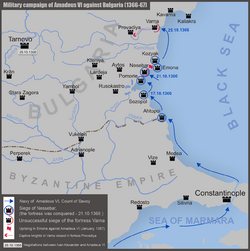 - 11 يونيو - بعد أن غادر شامبيري في 8 فبراير، أماديوس السادس من ساڤوا يصل البندقية حيث يحصل على أسطول للقيام بحملة عسكري لدعم القسطنطينية ضد بلغاريا (1366-1367). فاستولى على گاليپولي من العثمانيين في 23 أغسطس ثم دخل البحر الأسود لتحرير الإمبراطور الروماني الشرقي يوحنا الخامس پالايولوگوس (23 يناير 1367).