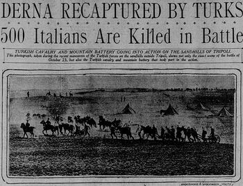 ، عن حرب طرابلس: الأتراك يستولون على درنة. مقتل 500 إيطالي في المعركة.