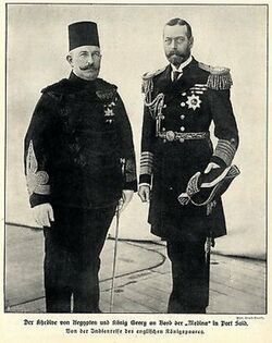 جورج الخامس وخديوي مصر عباس حلمي الثاني، على متن الباخرة HMS Medina في بورسعيد في 21 نوفمبر 1911، في طريق عودة العاهل البريطاني وقرينته من زيارة للهند ونـِپال في 1911 لحضور دربار التتويج.[1]