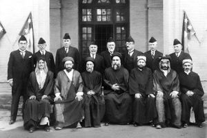 السيد محمد حسن الصدر يتوسط الجالسين، الصورة لأعضاء في مجلس الأعيان العراقي سنة 1933