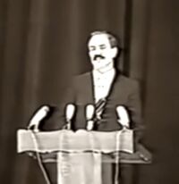 صدام حسين يتلو اسماء "المتأمرين" ويطلب منهم مغادرة قاعة الخلد للمحاكمة (22 يوليو 1979) |