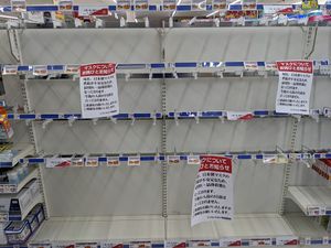 أرفف إحدى الصيدليات في اليابان بعد نفاذ الأقنعة في 3 فبراير 2020.