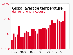- Climate scientists predict, using artificial intelligence, that global warming will exceed 1.5 °C in the next decade (scenario SSP2-4.5), and a nearly 70% chance of 2 °C between 2044 and 2065 (~2054) – a substantial probability of exceeding the 2 °C threshold – even if emissions rapidly decline (scenario SSP1-2.6).[147][148]